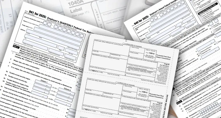 Some common forms include 1099, W-2s, Form 940, and Form 941. Each serves a specific purpose and is used to report different types of income, withholdings, and tax obligations.